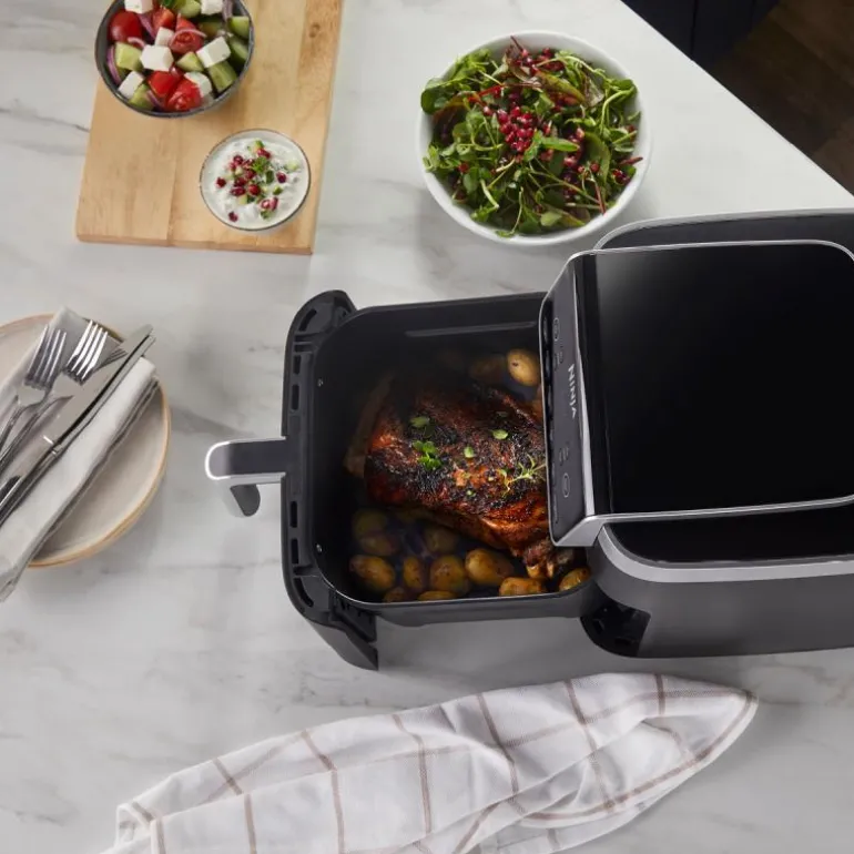 Med den justerbare crisper platen kan du tilberede maten på to forskjellige måter, slik at du oppnår den perfekte sprøheten hver gang. Og det beste av alt? Denne Ninja airfryeren er ikke bare rask og effektiv, den bruker også opptil 60% mindre energi enn en vanlig stekeovn, noe som betyr betydelige besparelser på strømregningen uten at du må gå på kompromiss med smaken.