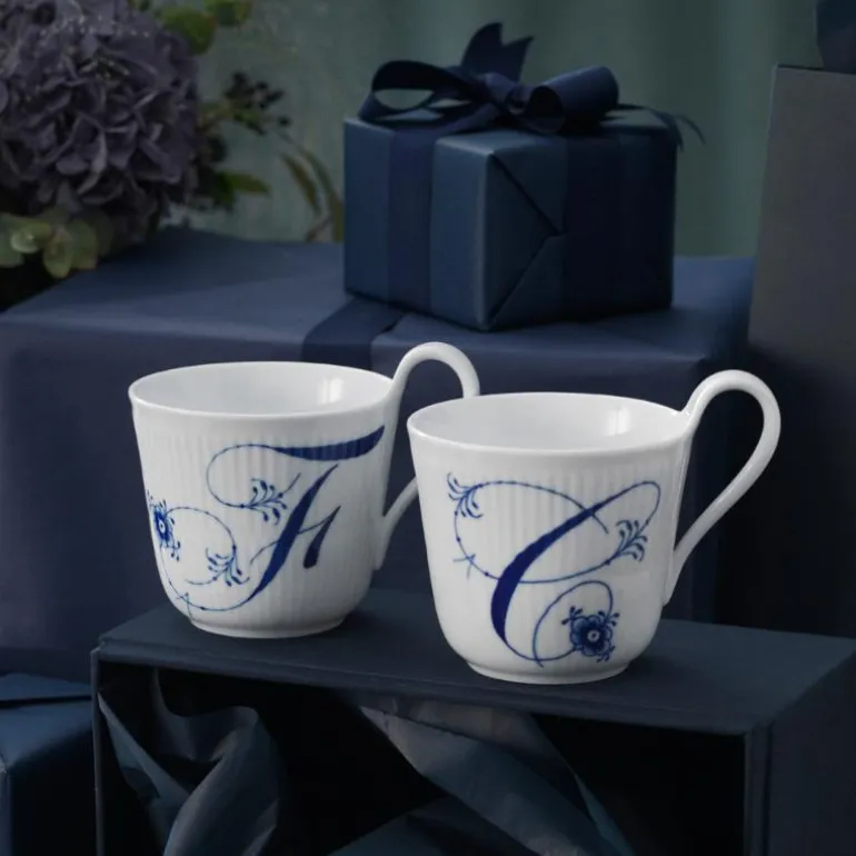 Høyhankskruset alfabet F på 33 cl er en Royal Copenhagen-klassiker, og hvorfor ikke sette et ekstra personlig preg på favorittkoppen din? På dette Alfabet-kruset med bokstav er de delikate palmettene og blomstene fra Musselmalt Riflet-kolleksjon vakkert integrert i bokstaven og håndmalt i klassisk koboltblå.