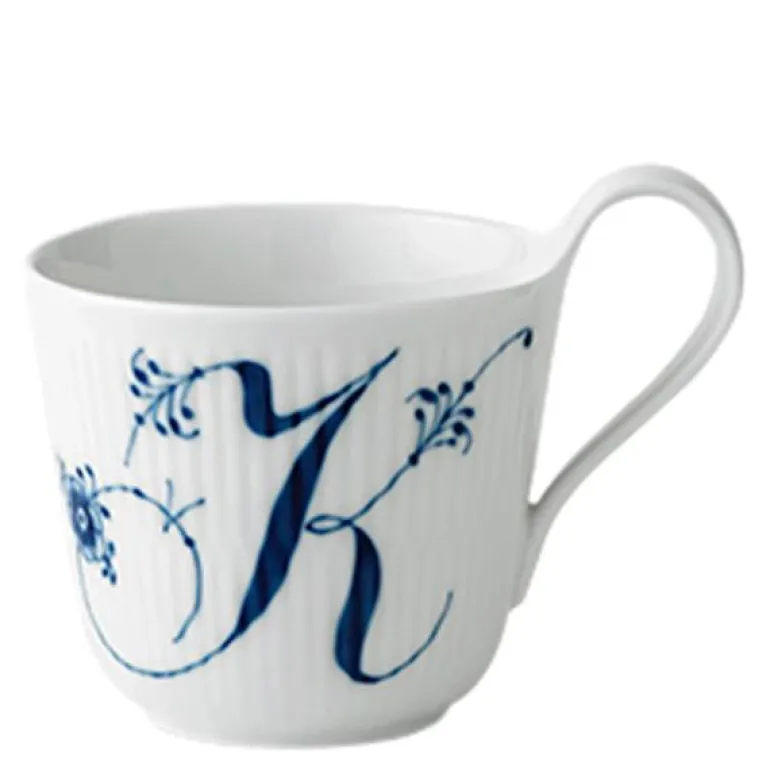Høyhankskruset alfabet K på 33 cl er en Royal Copenhagen-klassiker, og hvorfor ikke sette et ekstra personlig preg på favorittkoppen din? På dette Alfabet-kruset med bokstav er de delikate palmettene og blomstene fra Musselmalt Riflet-kolleksjon vakkert integrert i bokstaven og håndmalt i klassisk koboltblå.