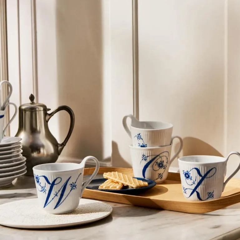 Høyhankskruset alfabet W på 33 cl er en Royal Copenhagen-klassiker, og hvorfor ikke sette et ekstra personlig preg på favorittkoppen din? På dette Alfabet-kruset med bokstaven W er de delikate palmettene og blomstene fra vår Musselmalt Riflet-kolleksjon vakkert integrert i bokstaven og håndmalt i klassisk koboltblå.