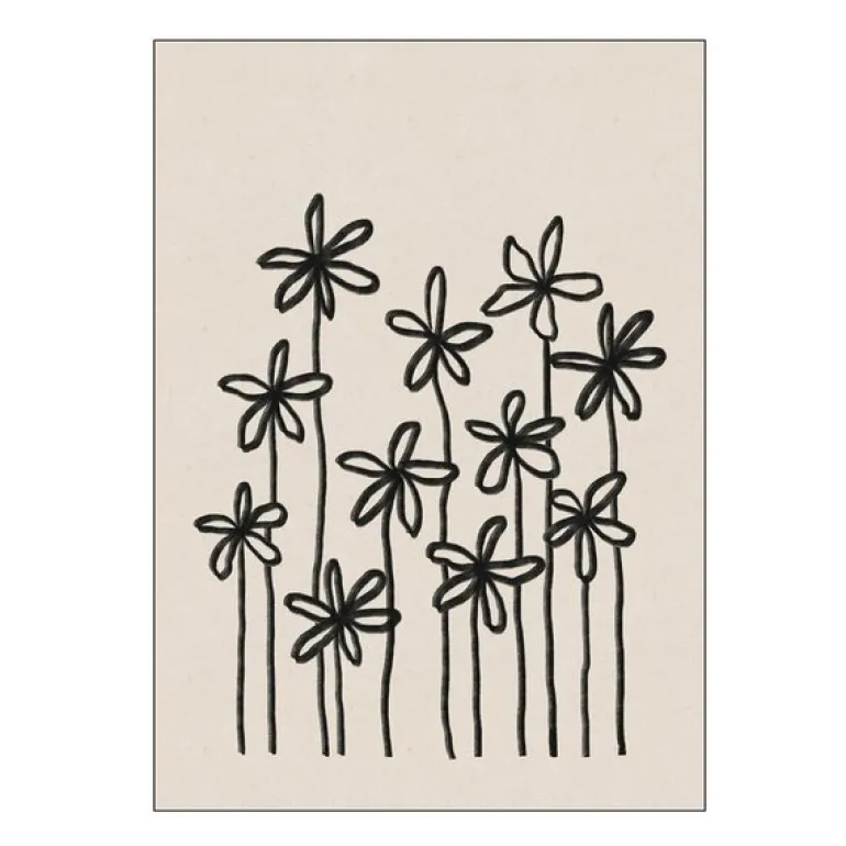 Alisa Galitsyna poster 50×70 cm a field of flowers fra Poster & Frame. Alisa Galitsynas «Field of Flowers»-plakat har et fengslende portrett av en jordisk tonet bakgrunn utsmykket med en serie svarte blomster tegnet på en linje i varierende høyder.