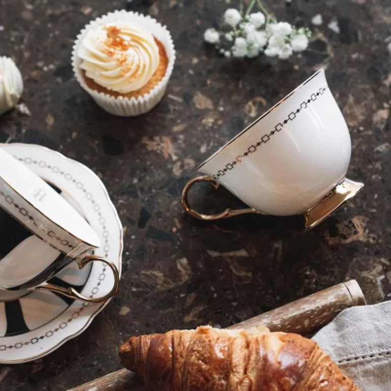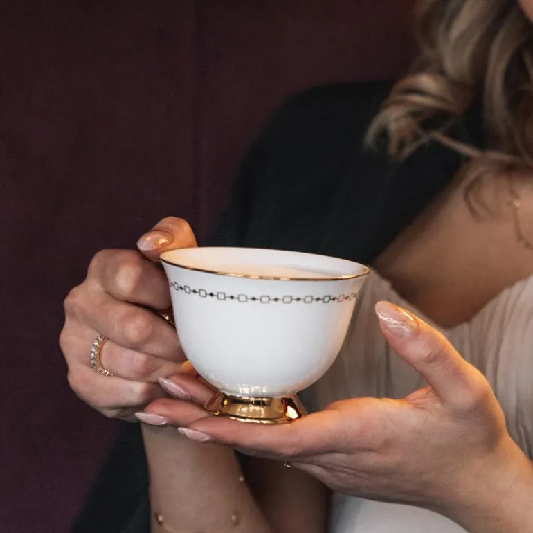 Koppen har en kapasitet på 22 cl, perfekt for å nyte en varm kopp te eller kaffe. Det elegante mønsteret i gull gir en fin touch til det hvite porselenet. Alle koppene har samme modell, men fargen og mønsteret varierer, slik at du kan enten velge å ha en enhetlig stil eller mikse og matche for å skape en unik og nydelig effekt.