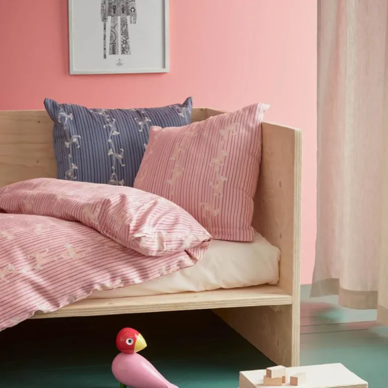 Sengetøyet er produsert i 100 % økologisk bomull og fås her i rosa. Ape Junior-sengetøyet vil sette sitt preg på alle slags barnerom.