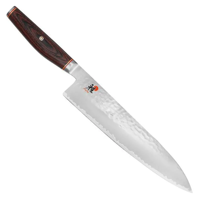 Artisan 6000 MCT har en kärna av (förädlat SG2 stål) hårt MC63 Micro Carbide pulverstål, CRYODUR® is-härdat till en hårdhet av ca. 63 HRC. Bladet är täckt med 2 lager (Tsuchime) hamrat rostfritt stål som ger kniven ett elegant utseende och förhindrar att råvaran fastnar vid användning. Slipvinkel ca: 19° och eggen är slipad enligt Honbazuke metoden. Ergonomiskt vackert handtag av Pakkawood. Livstidsgaranti på material och produktionsfel. Tillverkas till 100% i Seki, Japan. Gyutoh är japans svar på västvärldens kockkniv och kökets vanligaste kniv. Kockknivar finns i många format, typer och modeller. En kockkniv är oftast den första kniven du behöver när det kommer till köksknivar eftersom den är så väldigt mångsidig. Du kan både skiva tomater, hacka grönsaker, skära kött, fisk och mycket mer med denna modell, en riktig allround kniv. Kockknivarnas blad ska vara så högt att det går att hacka saker utan att knogarna slår i skärbrädan. Denna modell är en större rejäl modell på 24 cm och hackar/skär mer och större råvaror åt gången.