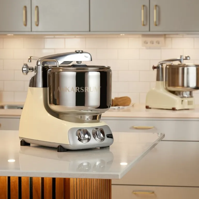 Designet på kjøkkenmaskinen i lys krem er et stilig og ikonisk design, som du gjerne kan la stå fremme på kjøkkenbenken.