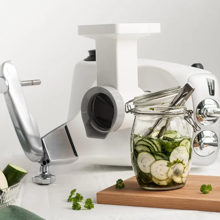 Designet på kjøkkenmaskinen i hvit matt er et stilig og ikonisk design, som du gjerne kan la stå fremme på kjøkkenbenken.