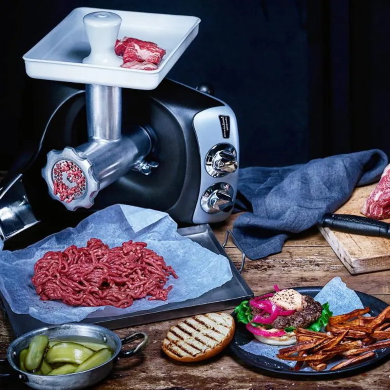 Original kjøttkvern til Ankarsrum Assistent. Leveres med kjøttkvern, 4,5mm hullskive, 3 pølsehorn, matebord, matepropp og sprutdeksel. Passer alle modeller (N1-N30).