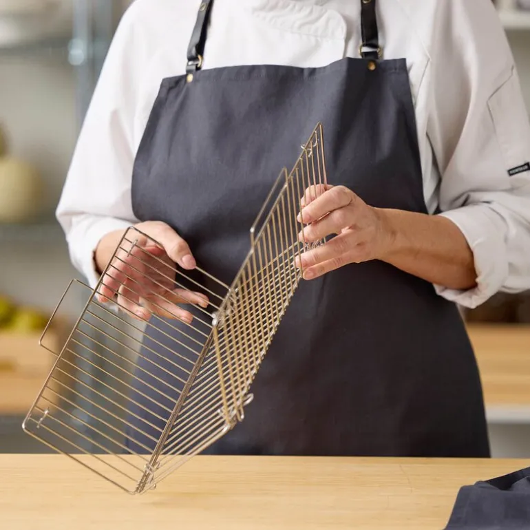 Etter bruk kan risten enkelt foldes sammen, slik at den tar minimalt med plass i skap eller skuffer – ideelt for små kjøkken. Produktet tåler oppvaskmaskin og bør vaskes før første gangs bruk. Et funksjonelt og plassbesparende valg for bakere på alle nivåer.