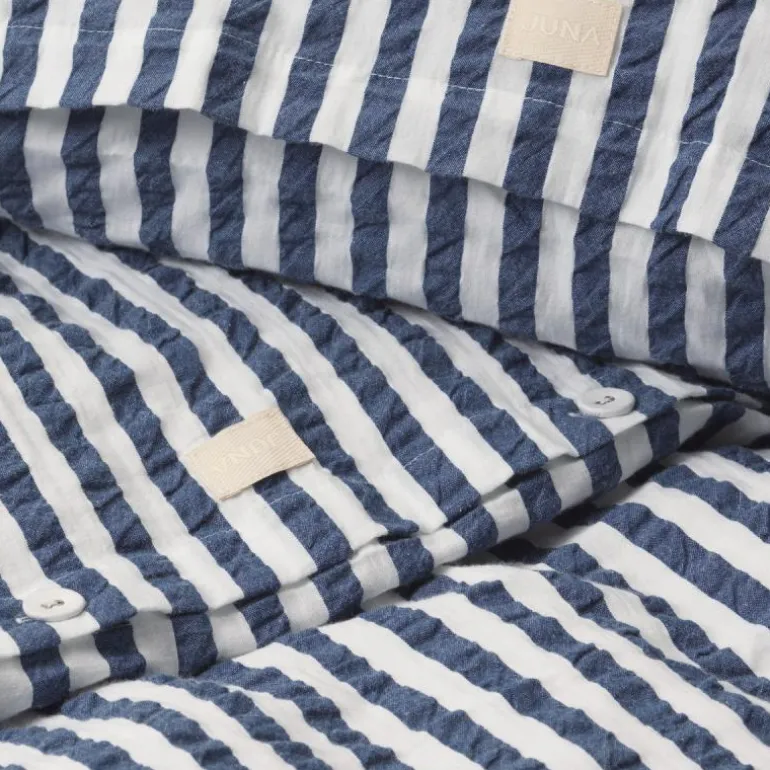 Juna handler om å nyte livet og gleden av et sengetøy som gjør livet vakrere, mykere, mer fargerikt og morsommere. Derfor er mønster og farger en stor del av Juna, og gir sengetøyet en koselig og avslappet følelse. Den velkjente og klassiske stripete vevingen tolkes i en moderne fargepalett, og det er denne kombinasjonen av den nostalgiske og moderne følelsen som bidrar til å skape en unik og glad Juna-atmosfære på soverommet. Stripete Bæk & Bølge i mørkeblått/hvitt har vakre sommerfarger som minner om stripete vintage fluktstoler og parasoller. Materialet er 100 % økologisk bomull som er både OEKO-TEX®-merket og GOTS-sertifisert. Putevaret har konvoluttlukking, og dynetrekket lukkes med knapper.