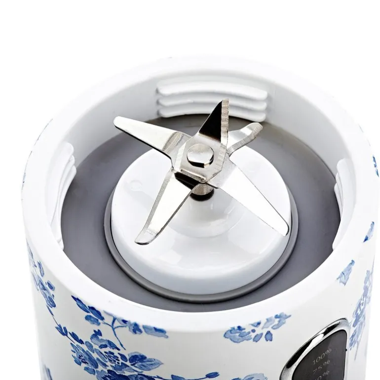 Laura Ashley bærbar smoothieblender i China Rose blå/hvit er laget for deg som ønsker en kompakt og kraftig blender med et stilfullt uttrykk. Den er utstyrt med en motor på 100 watt som yter opptil 25 000 omdreininger i minuttet, og de seks skarpe bladene i rustfritt stål sørger for at både is og frukt knuses effektivt. Ett-trykksfunksjonen gjør den enkel å bruke, og juicekoppen på 450 ml fungerer både som miksebeholder og drikkeflaske.