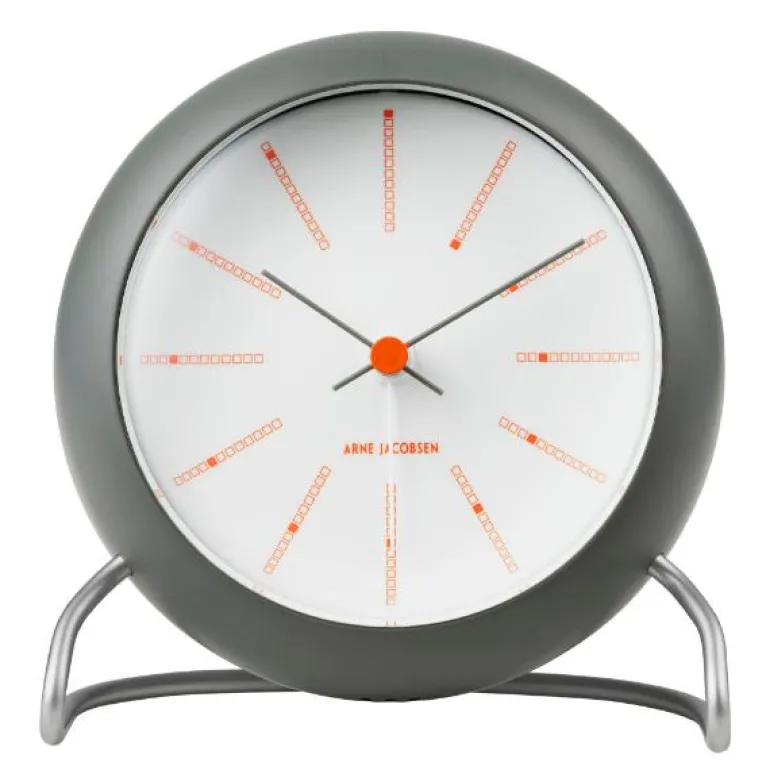 Arne Jacobsen utmerket seg som en arkitekt som lagde total design når han tegnet bygninger. I 1971 tegnet Arne Jacobsen National Banken i København. Til den vakre marmor kledde bygningen, tegnet Arne Jacobsen Bankers uret. Designet var moderne for sin tid og er det fortsatt. Den grå matte overflaten på uret er en hyllest til Arne Jacobsens favoritt materiale, nettopp den grå marmoren som National Banken er kledd i. De oransje detaljene er en moderne fortolkning av den røde prikken.
