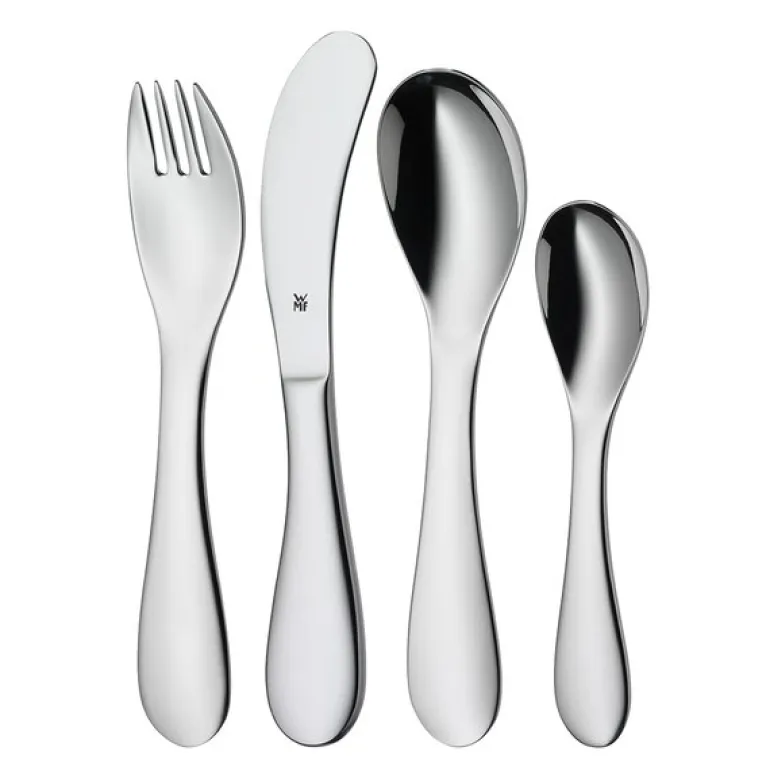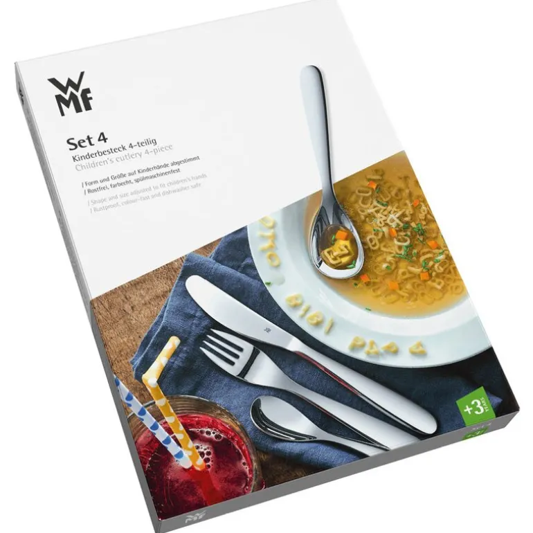Med barnebestikket fra WMF lærer småtassene å bruke kniv, skje og gaffel gjennom lek. Det ligger mer enn 125 års erfaring bak de barnevennlige bestikkdelene av rustfritt stål, som også begeistrer med kjærlig designede motiver og fargebilder. Hvert sett i 4 deler består av en barnekniv, en stor og liten barneskje og en barnegaffel. De største bestikkdelene og de kraftige skaftene egner seg ekstra godt til små hender og barns motorikk. Knivene i alle WMF-barnebestikk er stumpe og har ingen bølgesliping. Selve skjeen har avrundede kanter, og de korte, stumpe taggene på barnegaflene passer til små munner. Dekorasjonen med forskjellige motiver er omhyggelig forarbeidet. Bestikkene er av Cromargan® rustfritt stål 18/10, er langtidsholdbare, kan rengjøres i oppvaskmaskinen og er egnet til barn fra tre år.