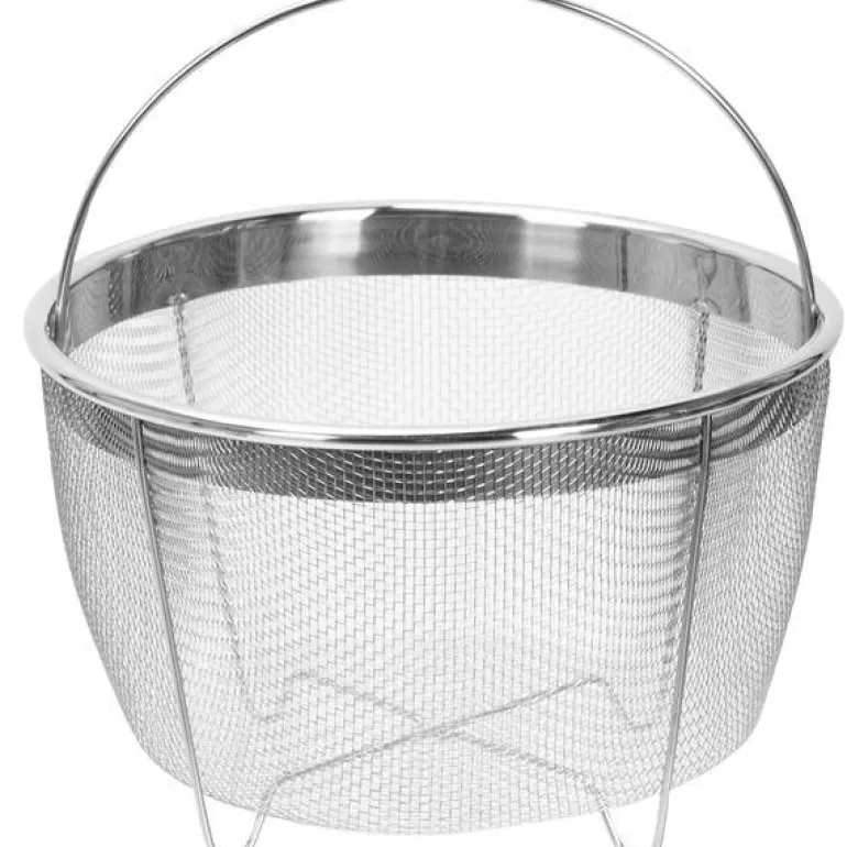 Dampkurv i 18/8 stål med håndtak. Plasseres i gryte for damping av grønnsaker, poteter eller kjøtt. Kan rengjøres i oppvaskmaskin.
