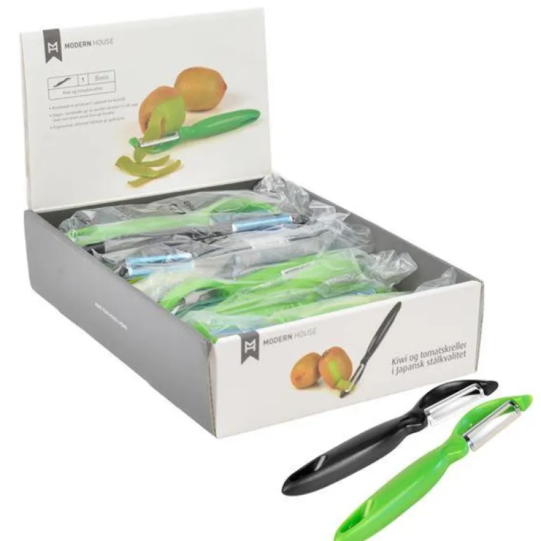 Pendelskreller fra Modern House, med ergonomisk utformet grep som er spesielt tilpasset skallet til for eksempel kiwi og tomat. Skrelleren har et sagblad som får tak på slikt glatt og tettsittende skall.