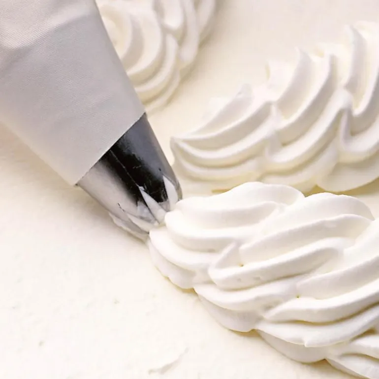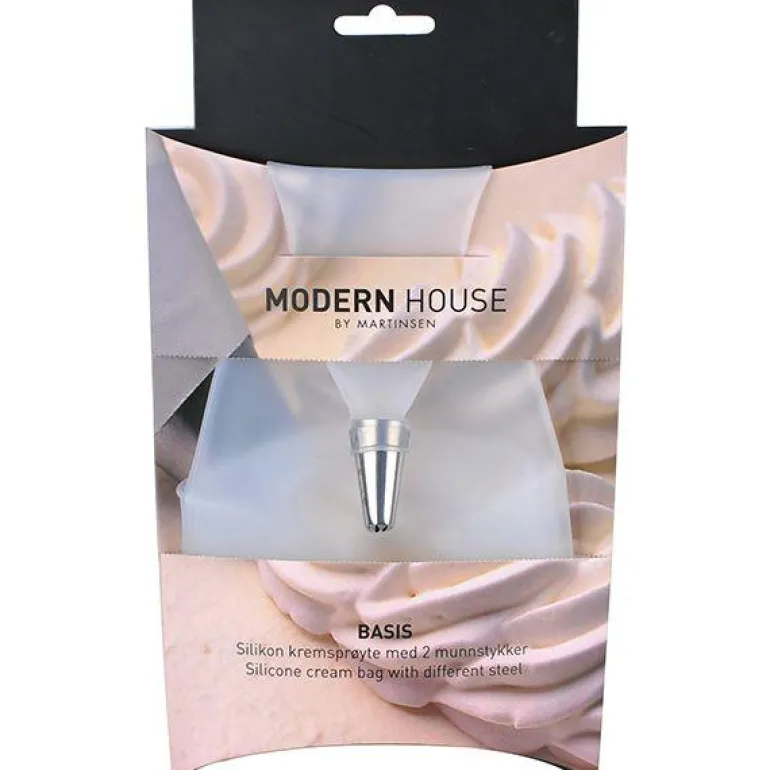 Kremsprøyte med 2 munnstykker som passer til ulike typer krem og dekorering. Produsert i BPA fri silikon med munnstykker i stål. Varens form gjør at håndvask er best egnet til rengjøring. Spyles med varmt vann og litt såpe.