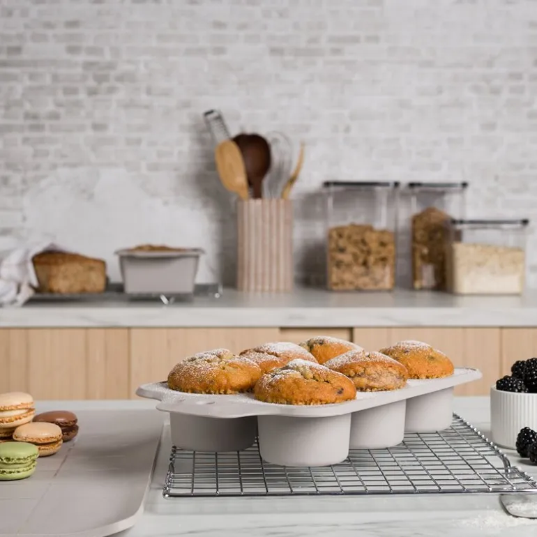 Bayk muffinsform fra Modern House er et fleksibelt bakeverktøy med seks rom, perfekt for å lage muffins eller små bakverk. Formen er laget av BPA-fri silikon som tåler opptil 230°C og gjør det enkelt å ta ut ferdig bakverk uten at det setter seg fast. Totalt rommer formen 0,9 liter.