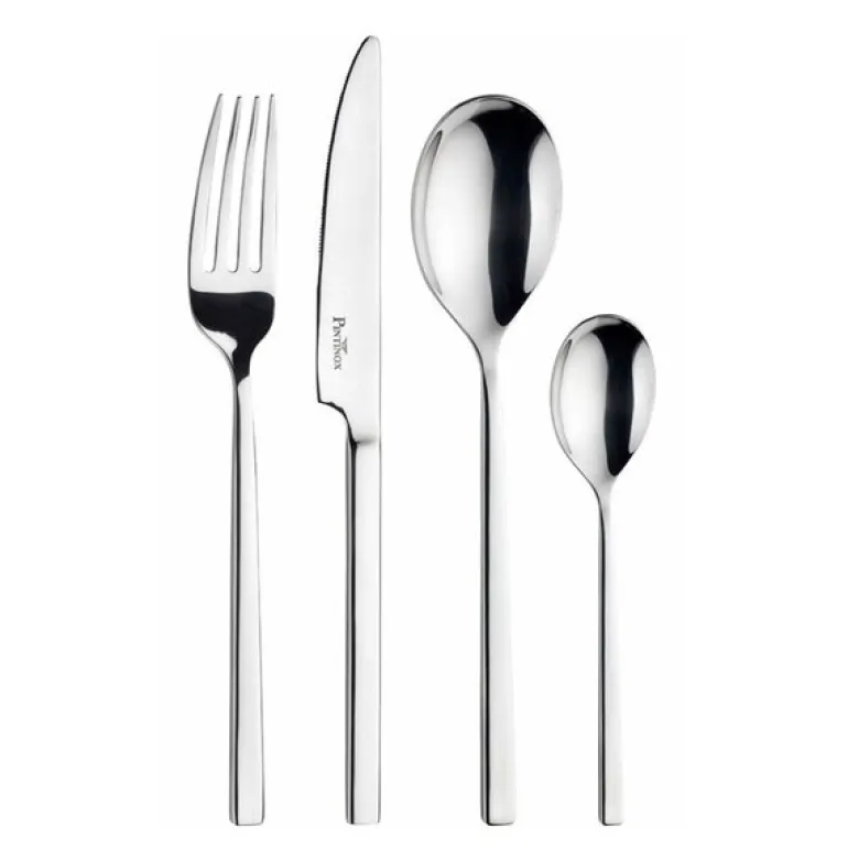 Bestikksettet Tie fra Pintinox består av 24 deler i rustfritt stål, laget for seks personer. Settet inkluderer seks kniver, seks gafler, seks spiseskjeer og seks kaffeskjeer. Hver del har en karakteristisk firkantet form som gir bestikket en moderne vri på en ellers klassisk stil.