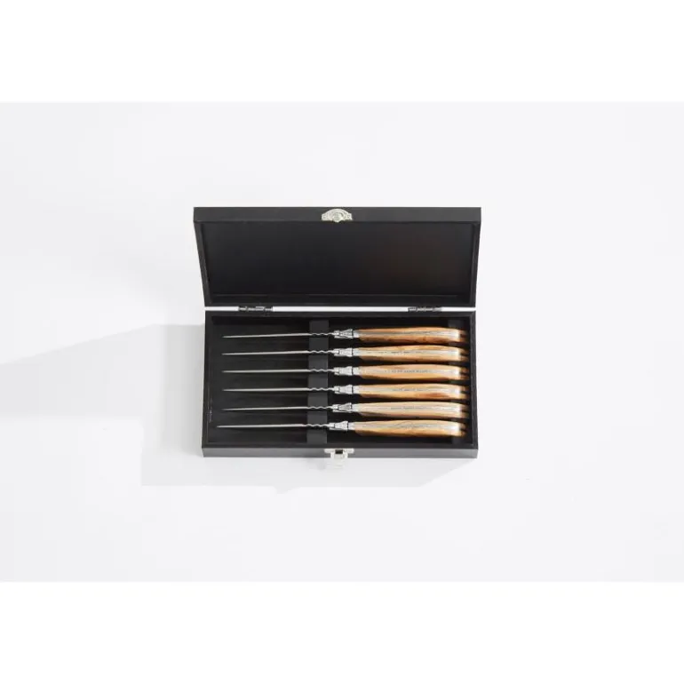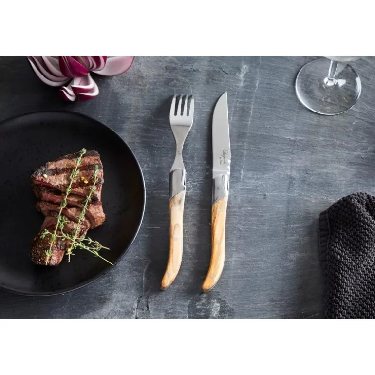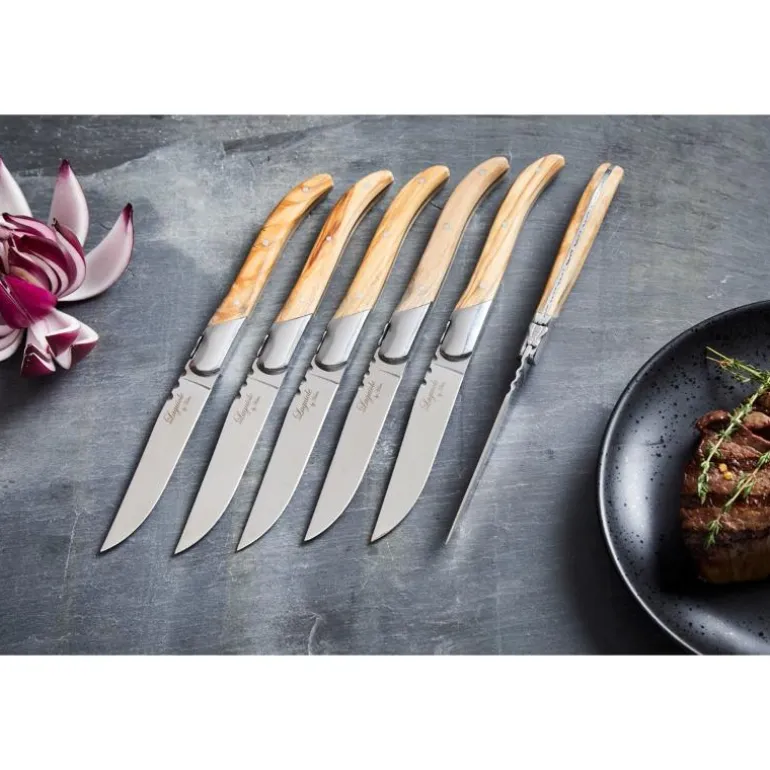 Laguiole er navnet på den spesielle formen som knivene har. Navnet kommer fra en fransk by.Knivene er laget av 420 rustfritt stål og merket med en logo. Knivsettet består av 6 biffkniver med oliventreskaft, og kommer i en svart gaveeske i tre.Det finnes også matchende gafler.