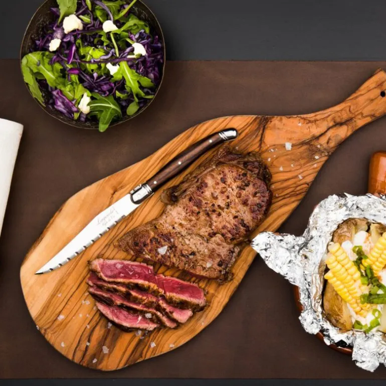 Dette settet med biffkniver fra Laguiole Style de Vie Premium Line inneholder seks kniver med håndtak i dark wood-finish. Knivene er 23 cm lange og har taggete blader i rustfritt stål med en tykkelse på 1,8 mm, noe som gir god ytelse ved skjæring av kjøtt og grillretter.