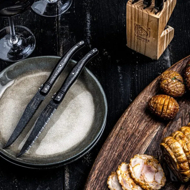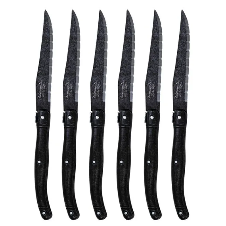 Dette settet med biffkniver fra Laguiole Style de Vie Premium Line består av seks solide kniver i rustfritt stål med en mørk stonewash-finish. Bladene er 23 cm lange, taggete og har en tykkelse på 1,8 mm – utviklet for å kutte kjøtt effektivt og presist.