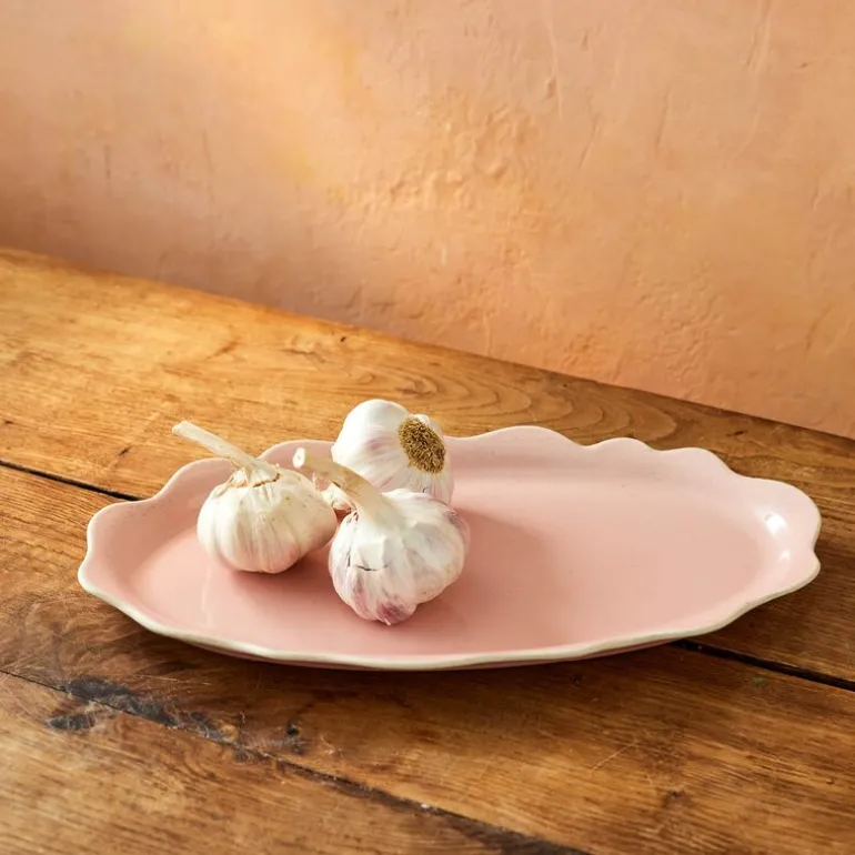 Den elegante riflede kanten gjør fatet enkelt å sende rundt bordet, perfekt for alt fra glasert gulrøtter til delikate småretter som crudités og hummus. Det slanke designet gjør det enkelt å integrere fatet i enhver bordsetting, mens den rosa fargen tilfører et subtilt, men sofistikert preg til borddekorasjonen.