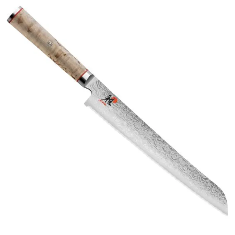 Birch 5000 MCD brødkniv fra Miyabi er en 23 cm lang kniv utformet for å skjære gjennom brød uten å klemme det sammen. Den tannede eggen gjør det enkelt å kutte gjennom harde skorper samtidig som brødets struktur bevares. Kniven egner seg også godt til andre råvarer med hard overflate, som ananas eller melon, der en ekstra skarp og kraftfull egg er nødvendig.
