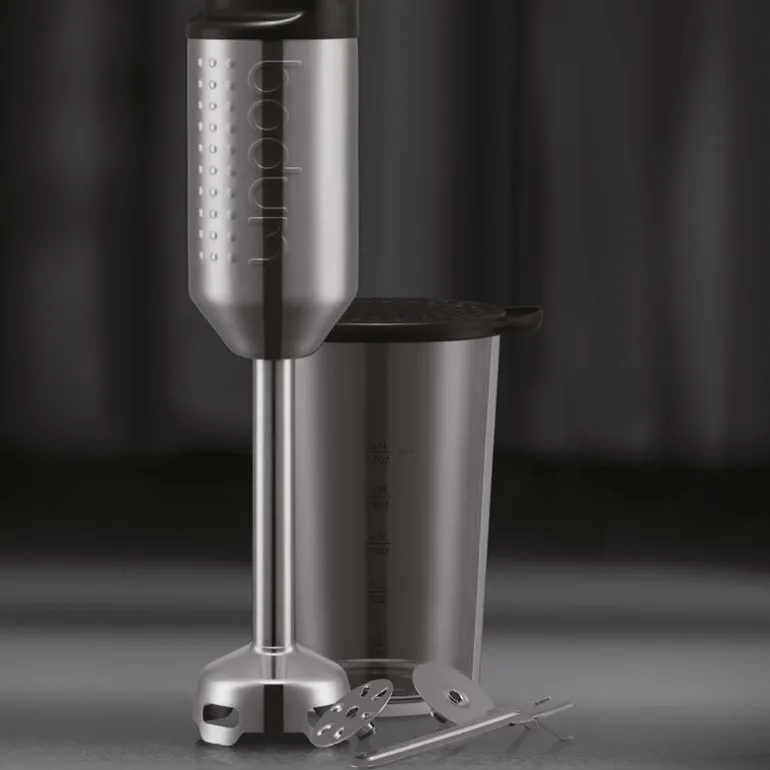 Bistro stavmikser med tilbehør fra Bodum er utviklet for å gjøre matlaging mer effektiv. Med to hastigheter og flere tilbehør i rustfritt stål, gir den deg mulighet til å lage alt fra babymat til pisket krem. Beholderen som følger med, kan også brukes til oppbevaring av ferdiglagde blandinger.
