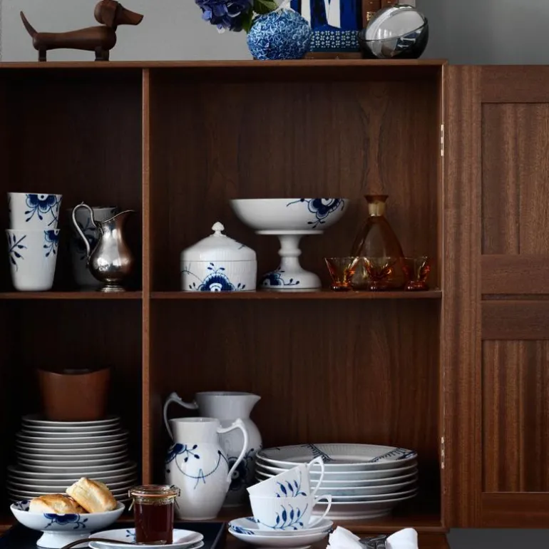Blå Mega Riflet er både gjenkjennelig og overraskende forfriskende. I denne uvanlige nytolkningen av det klassiske mønsteret Musselmalt Riflet, har utvalgte detaljer blitt forstørret, men er fortsatt malt for hånd, slik at den originale og levende blå effekten er bevart. Mønsteret Blå Mega Riflet ble skapt av den unge designstudenten Karen Kjældgård-Larsen i 2000, og dette signaliserte starten på et nytt eventyr. Det berømte håndmalte mønsteret har blitt et kjent navn igjen som uttrykker både sin historiske autentisitet og kreative, innovative tenkning. Blå Mega Riflet ble opprinnelig designet med 8 forskjellige mønstre. På baksiden av Mega-produktet vil du finne et nummer. Dette refererer til mønsteret på dette bestemte produktet. Porselen.