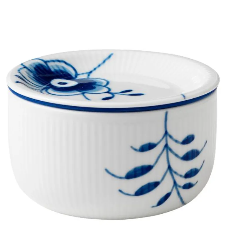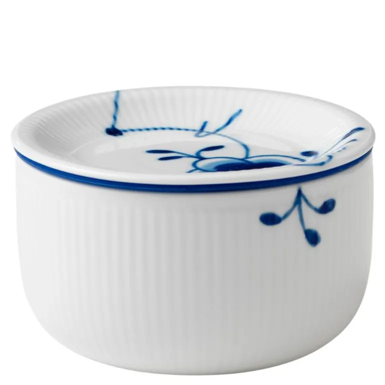 Blå Mega Riflet oppbevaringskrukke 33 cl. Blå mega riflet er en nytolkning av Musselmalt riflet – mønsteret fra 1775 som har blitt en del av Danmarks kulturarv. I Mega har utvalgte deler av det opprinnelige mønsteret blitt forstørret av Karen Kjælgård-Larsen. Hver del av serien er unik og håndmalt, akkurat som Musselmalt riflet. Kan vaskes i oppvaskmaskin.