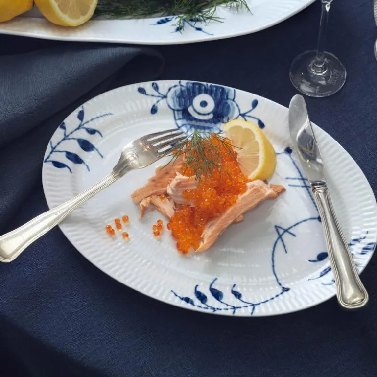 Blå Mega Riflet er både gjenkjennelig og overraskende forfriskende. I denne uvanlige nytolkningen av det klassiske mønsteret Musselmalt Riflet, har utvalgte detaljer blitt forstørret, men er fortsatt malt for hånd, slik at den originale og levende blå effekten er bevart. Mønsteret Blå Mega Riflet ble skapt av den unge designstudenten Karen Kjældgård-Larsen i 2000, og dette signaliserte starten på et nytt eventyr. Det berømte håndmalte mønsteret har blitt et kjent navn igjen som uttrykker både sin historiske autentisitet og kreative, innovative tenkning. Blå Mega Riflet ble opprinnelig designet med 8 forskjellige mønstre. På baksiden av Mega-produktet vil du finne et nummer. Dette refererer til mønsteret på dette bestemte produktet. Porselen.