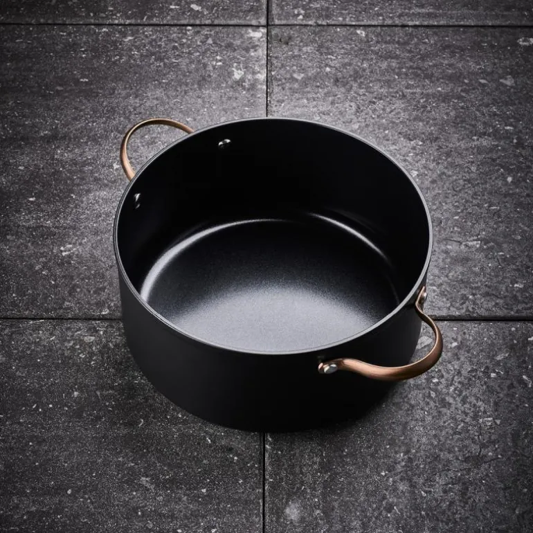 Black Copper gryte på 6 liter fra Modern House er et imponerende kjøkkenredskap som kombinerer funksjonalitet og elegant design. Laget av belagt aluminium med kobberfarget håndtak, gir gryten et moderne og eksklusivt preg. Den tykkbunnete konstruksjonen sørger for jevn varmefordeling, noe som sikrer perfekte resultater ved tilberedning av alle typer mat.