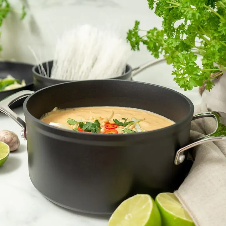 Black line gryte 3L svart, fra Modern House. Black Line er en førsteklasses serie av gryter og panner laget i belagt aluminium, kjent for sin tykkbunnede konstruksjon som sikrer jevn varmefordeling. Serien er utstyrt med det avanserte KFCC G7 keramiske belegget, som gir enestående slipp-lett egenskaper. Dette hardføre keramiske belegget hindrer at mat svir seg lett, noe som gjør produktene svært enkle å rengjøre.