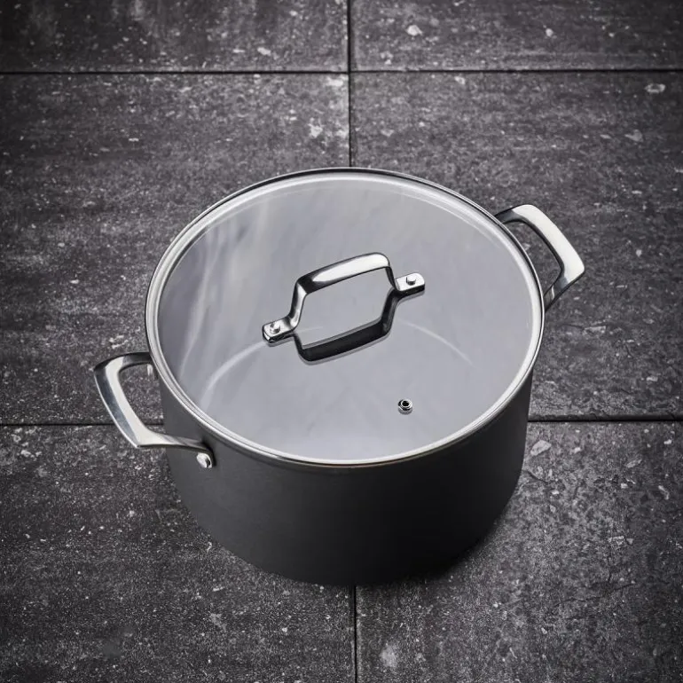 Black line gryte 7L svart, fra Modern House. Black Line er en førsteklasses serie av gryter og panner laget i belagt aluminium, kjent for sin tykkbunnede konstruksjon som sikrer jevn varmefordeling. Serien er utstyrt med det avanserte KFCC G7 keramiske belegget, som gir enestående slipp-lett egenskaper. Dette hardføre keramiske belegget hindrer at mat svir seg lett, noe som gjør produktene svært enkle å rengjøre.