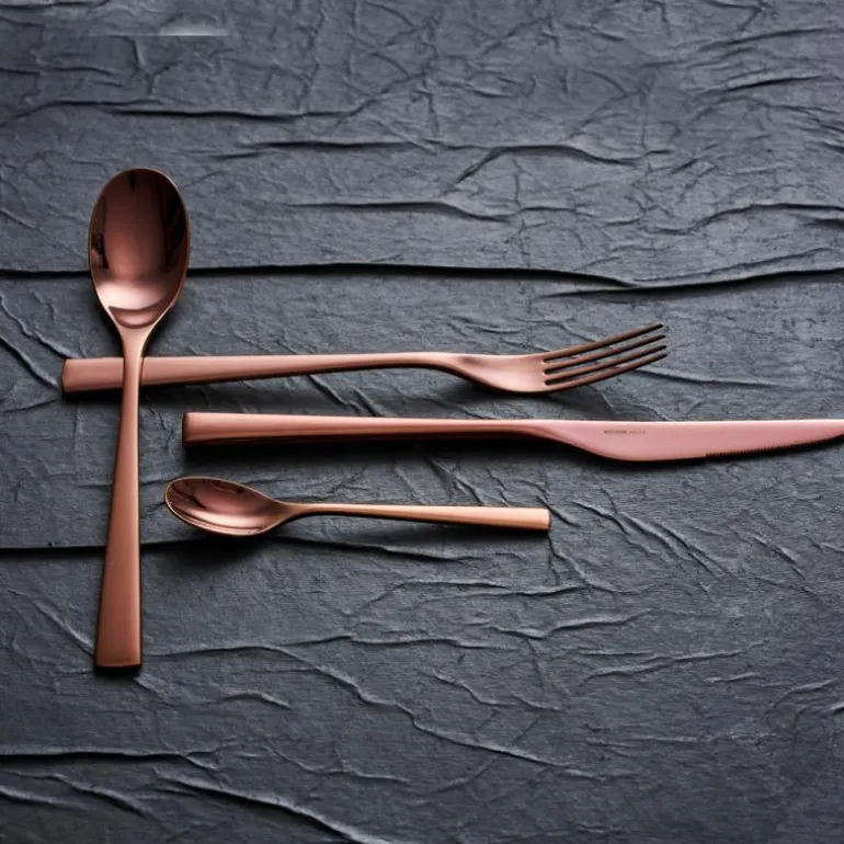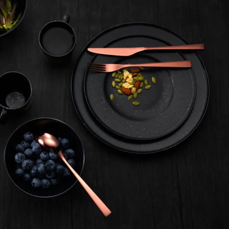 MODERN HOUSE design Black Rose er et kobberfarget bestikk, produsert i 18/8 (knivblad 13/0) stålkvalitet som er motstandsdyktig mot flekker og korrosjon, men selv de fineste legeringer vil svekkes om det utsettes for eksempelvis etsende/syreholdig mat, salt, høyt mineralinnhold i vann, sterke vaske/blekemidler. Stål 18/8 betyr at det består av 18% krom og 8% nikkel. Bestikket kan rengjøres i oppvaskmaskin på skånsomt program (45°C).4 kniv4 gaffel4 skje4 teskjeVær oppmerksom på følgende for å forlenge levetiden på bestikket:1. Skyll salt eller mat fra bestikk rett etter bruk. Dette for å unngå rust og andre flekker som kan oppstå, spesielt av mat med høyt syreinnhold.2. Oppvaskmaskin – Fjern matrester før bestikket settes inn i oppvaskmaskin. Velg skånsomt program. Ta ut bestikket fra oppvaskmaskinen umiddelbart etter tørking. Tørk av fuktighet, før bestikket legges bort. Dette for å unngå rust og andre flekker som kan oppstå, spesielt av mat med høyt syreinnhold.3. Håndvask, – bruk varmt vann tilsatt flytende vaskemiddel og skyll grundig. Vann mykner kan være nødvendig dersom høyt mineralinnhold i vannet. Tørk umiddelbart etter vask med en myk klut.4. Såpe med skuremiddel eller oppvaskskrubb skal ikke benyttes, da det vil gi skraper i belegget.5. Messing og kobber polering må ikke benyttes på bestikket!
