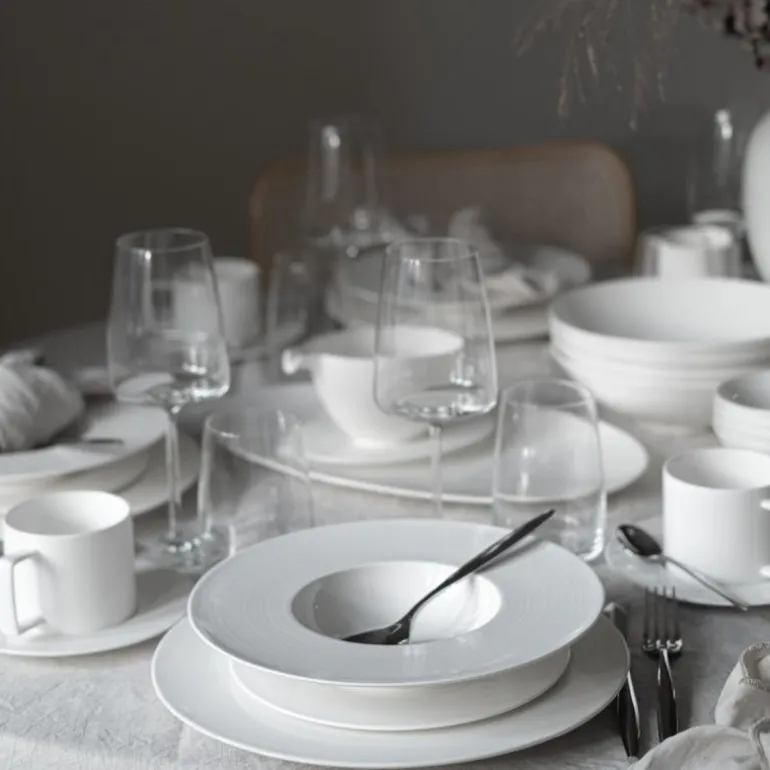 Tallerkenens dybde gjør den ideell for alt fra kremete supper til smakfulle pastaretter og andre delikate retter som krever litt ekstra plass. Laget av førsteklasses benporselen, også kjent som Bone China, kombinerer tallerkenen holdbarhet med en delikat glans og letthet. Dette materialet, som består av en blanding av benaske, kaolin, feltspat og kvarts, gir tallerkenen sin karakteristiske styrke og eleganse.