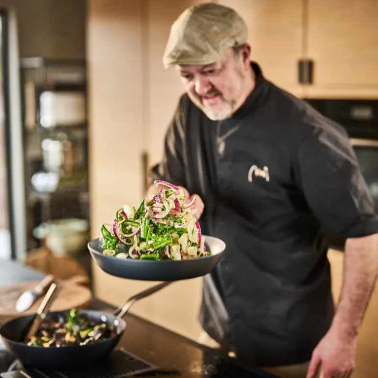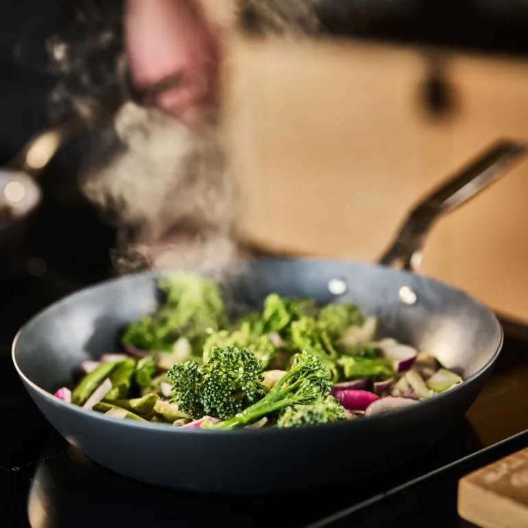 Blue Carbon stekepanne fra Modern House er en allsidig panne laget av høykvalitets karbonstål. Dette materialet sikrer rask og jevn oppvarming, noe som gjør pannen ideell til steking, bruning, sautering, frityrsteking og grilling. Den ubelagte blå/grå overflaten er helt fri for kjemikalier og PFAS, noe som gir et trygt og bærekraftig valg for både profesjonelle kokker og hobbykokker.