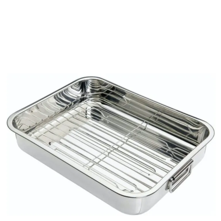 KitchenCraft Blue Card langpanne med rist (38 x 27,5 cm) i rustfritt stål er en solid og elegant panne, perfekt for å tilberede smakfulle middager for tre til fire personer. Denne mellomstore pannen er laget for å håndtere alt fra kjøtt til fjærkre på en jevn og skånsom måte, der saftene samles under kjøttet takket være den medfølgende risten. Rustfritt stål uten belegg gir høy ytelse og er ideelt for profesjonelle resultater, samtidig som det er slitesterkt og ripesikkert.