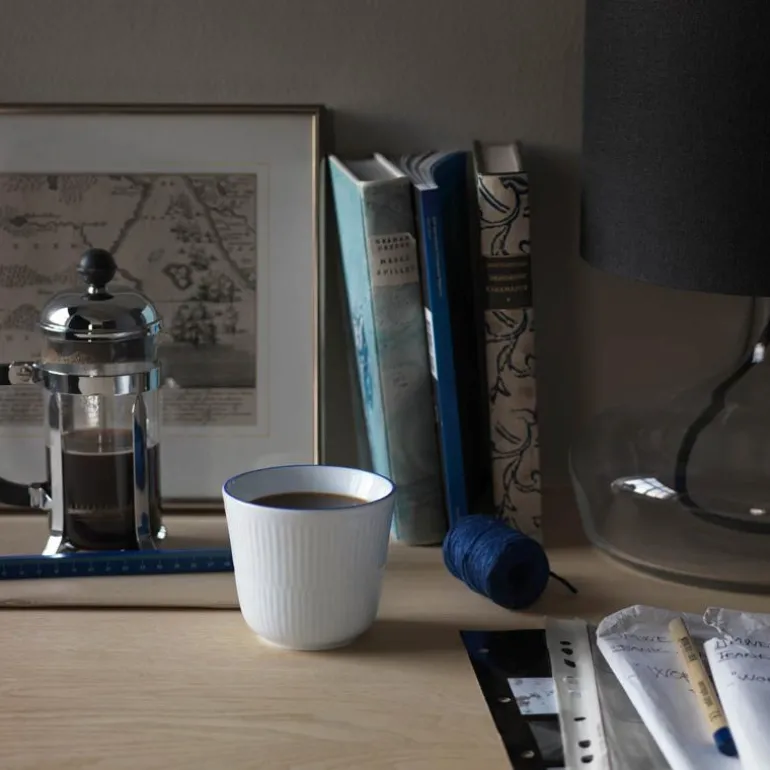 Termokruset i Blueline uttrykker funksjonell estetikk. Ingen hank, men bare rene linjer og minimalistisk skjønnhet. Som en skatt i dypet er Royal Copenhagens logo stemplet i bunnen av kruset – bare synlig ovenfra, bare synlig ved siste slurk. Fra siden er de hvite rillene og den blå linjen malt med imponerende presisjon langs kanten av kruset. Helt enkelt, helt unikt. Kan vaskes i oppvaskmaskin.