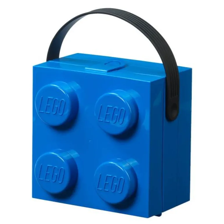 Blå legoboks med svart håndtak, fra LEGO®. Den firkantede boksen i det klassiske LEGO klossedesignet har et mykt silikonhåndtak for enkel transport. Den kan brukes som matboks, oppbevaringsboks eller bæreveske. Lokket på boksen kan enkelt åpnes og låses med den lille klipsen, og det er festet til bunnen. Dette gjør den egnet selv for små LEGO fans som ønsker å ta med seg LEGO eventyret på piknik, på skolen eller hvor som helst de går.