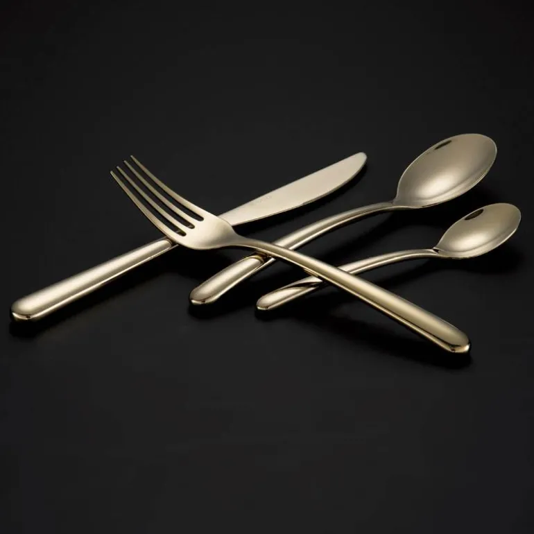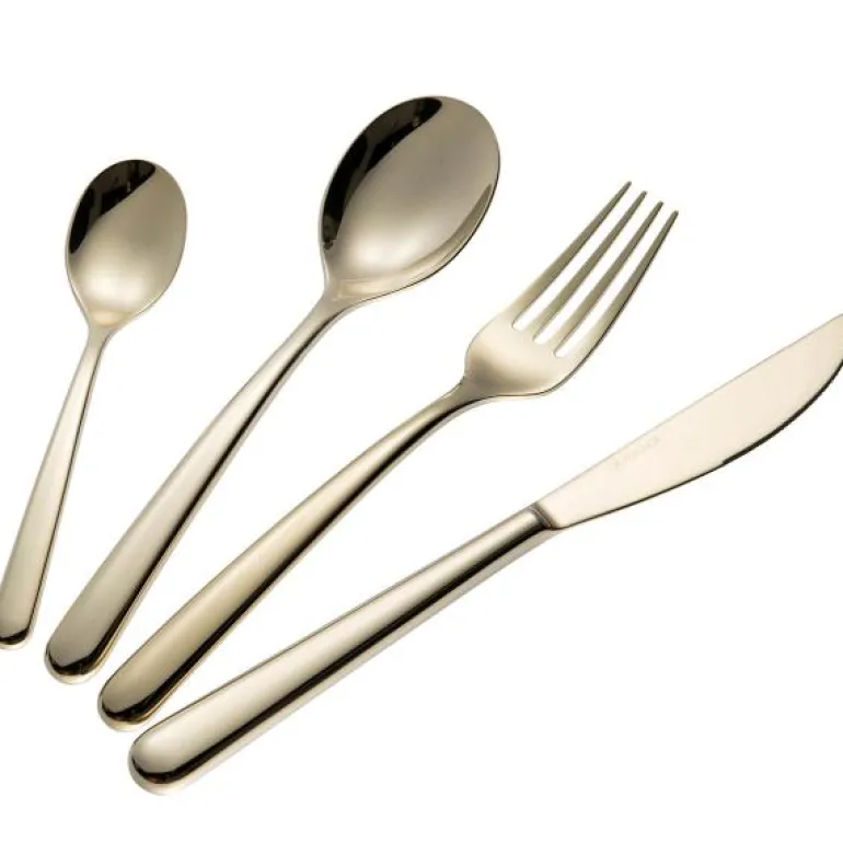 Bestikksett, Bright 24 deler gullfarget coating, fra Magnor. Bright er et solid, klassisk og elegant bestikk som vil tilføye stil og glam til det dekkede bordet. Den polerte og glansfulle finishen vil løfte borddekkingen som gjør Bright til et bestikk for hver anledning. Designerne hos Studio Magnor har latt seg inspirere av det minimalistiske, enkle og rene i dagens skandinaviske uttrykk i formgivningen av Bright.