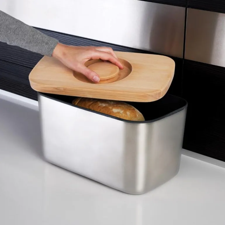 Flott brødboks i stål med mye plass. Laget av 18/8 stål med børstet overflate, og lokket er i bøketre. Den er 35 cm lang, 21,5 cm bred og 18,5 cm høy. Gummiben som holder den stabil på benken. Kan rengjøres i oppvaskmaskin, men lokket bør rengjøres for hånd.
