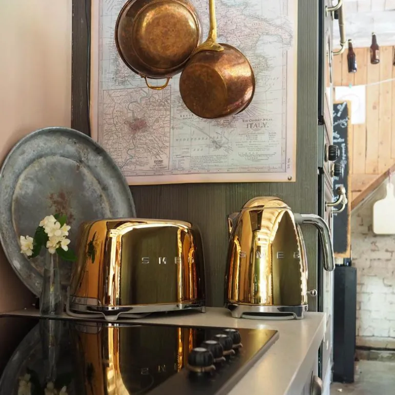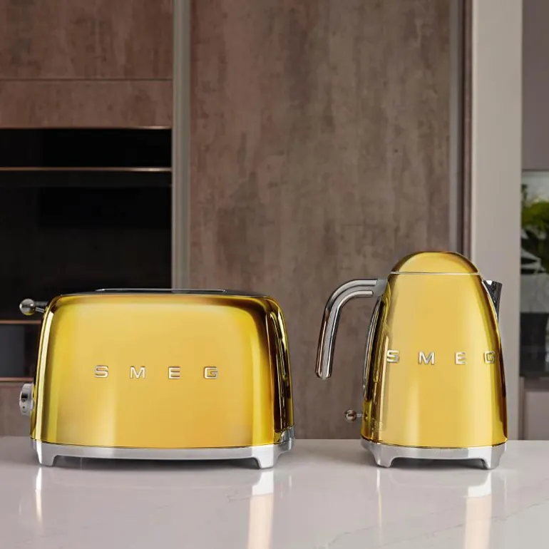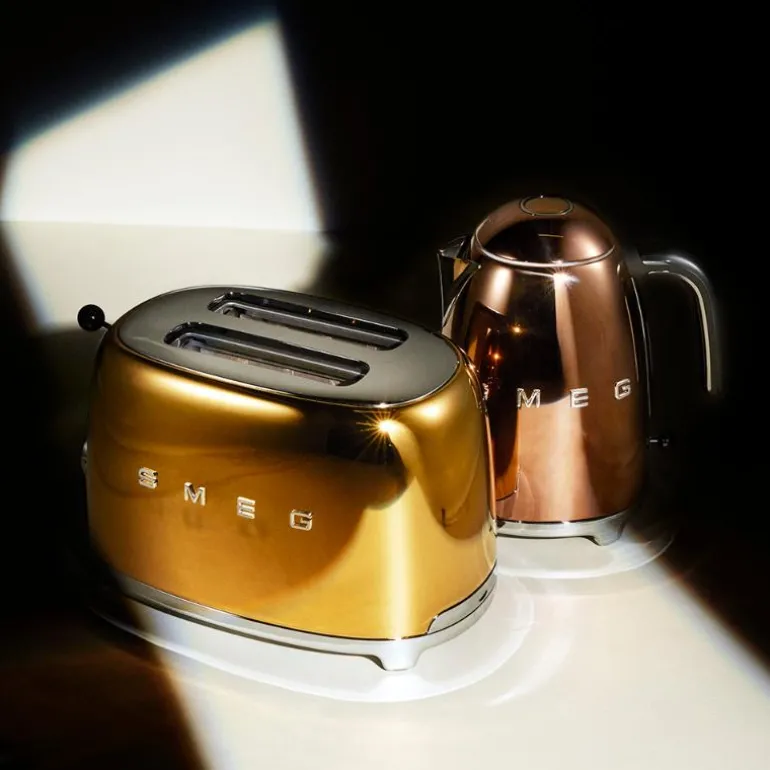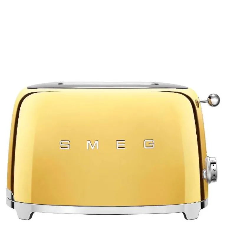 SMEG brødrister (TSF01) gull kombinerer 50-talls retrodesign med moderne teknologi. Brødristeren rister to skiver om gangen og har 6 ulike innstillingsnivåer. Det stilfulle designet i gull gjør brødristeren samtidig til et blikkfang på kjøkkenet ditt.
