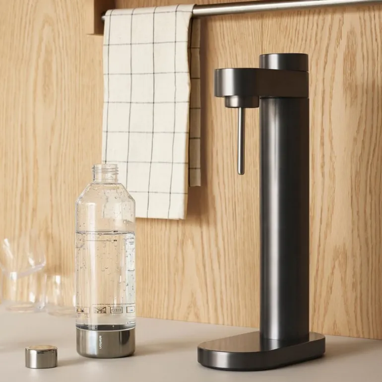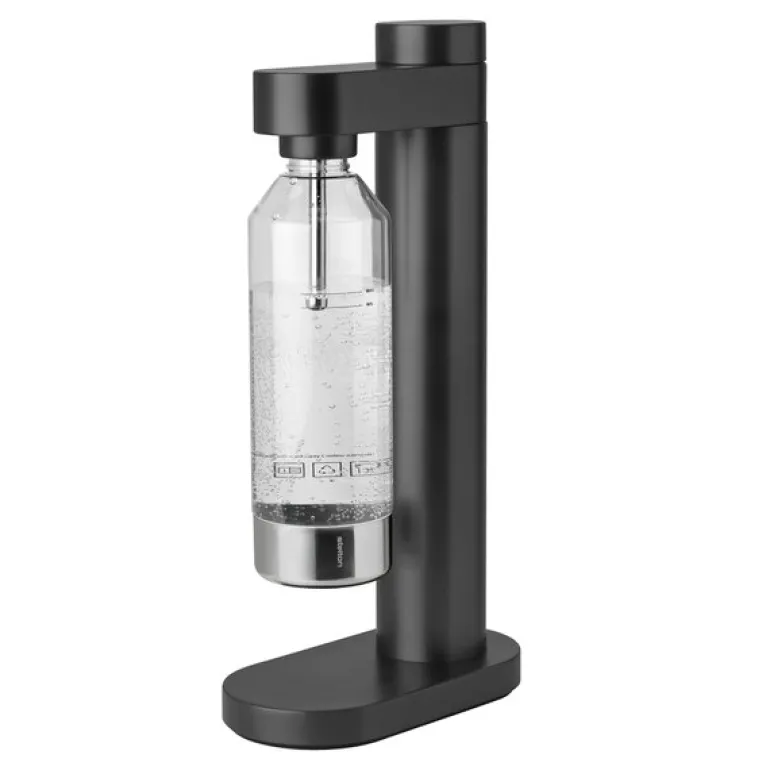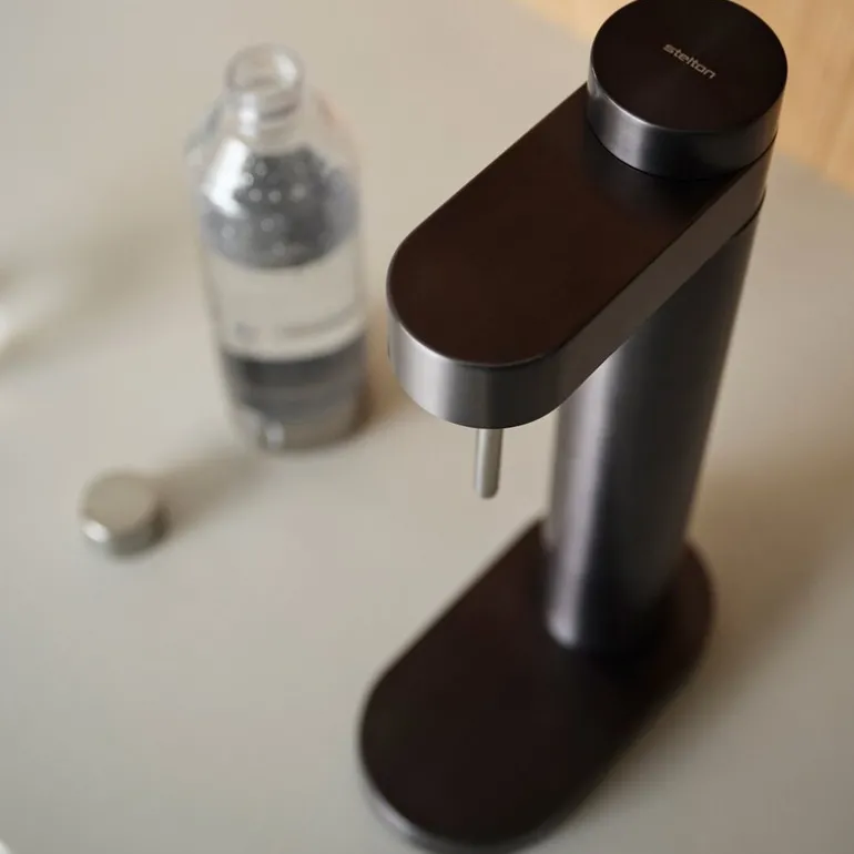 Dekorativ og praktisk kullsyremaskin, Brus i fargen svart metallic, fra Stelton. Med Brus kullsyremaskin sparer du miljøet for store mengder av unødvendig plast ved å lage ditt eget boblevann i gjenbrukbare flasker. Designet er så elegant at du kan glede deg over å ha den stående fremme på kjøkkenbenken.
