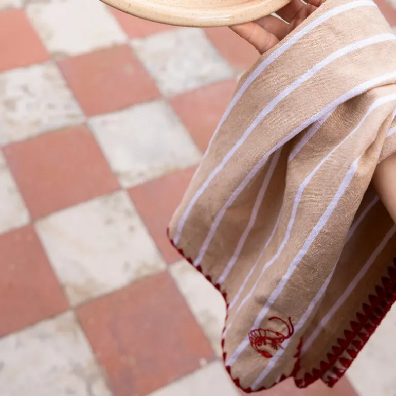 Gjør kjøkkenet ditt både praktisk og elegant med Bubba kjøkkenhåndkle fra BYON. Denne to-pakningen inkluderer håndklær i beige og hvite striper, pyntet med en scalloped kant og en kontrasterende rød detalj som tilfører en raffinert karakter. De broderte rekene gir et lekent og unikt preg som skiller seg ut.