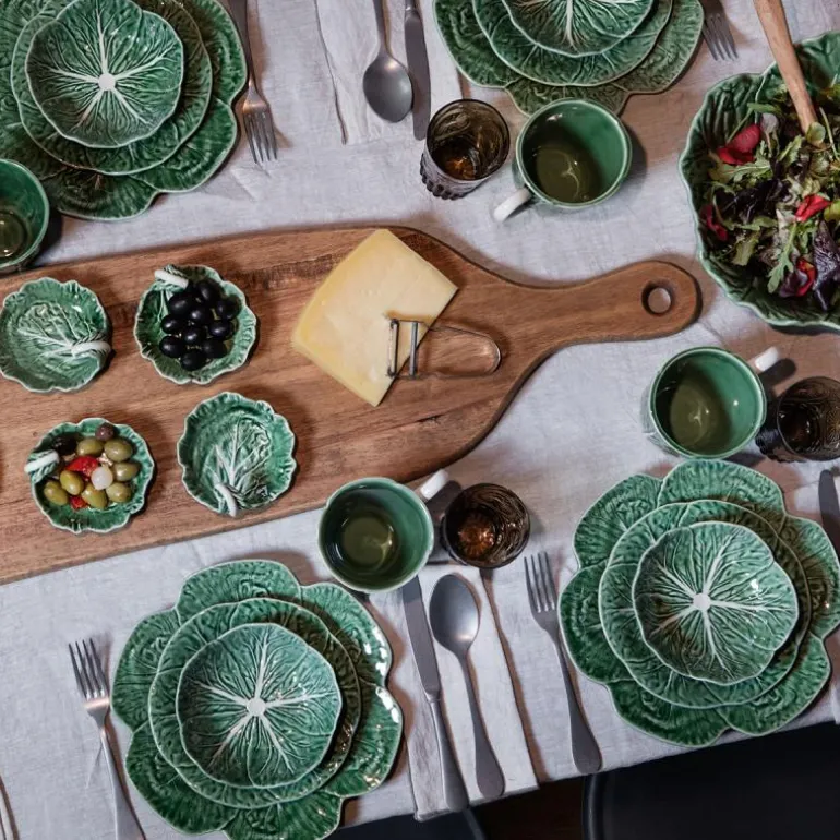 Cabbage Fat 30,5 cm fra Bordallo Pinheiro. Kjøkkenserien Cabbage er en serie med svært detaljerte og realistisk gjengitte skåler og fat som forestiller kålblader, designet av keramikeren Bordallo Pinheiro. Fatene og skålene blir et vakkert innslag til borddekkingen og det større fatet passer perfekt til ost, brød eller frukt.