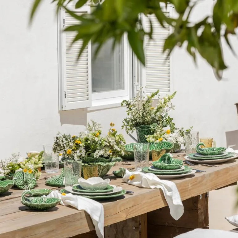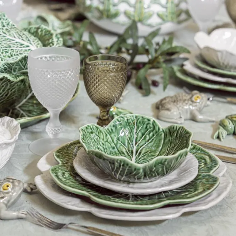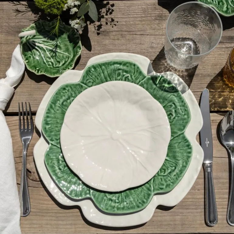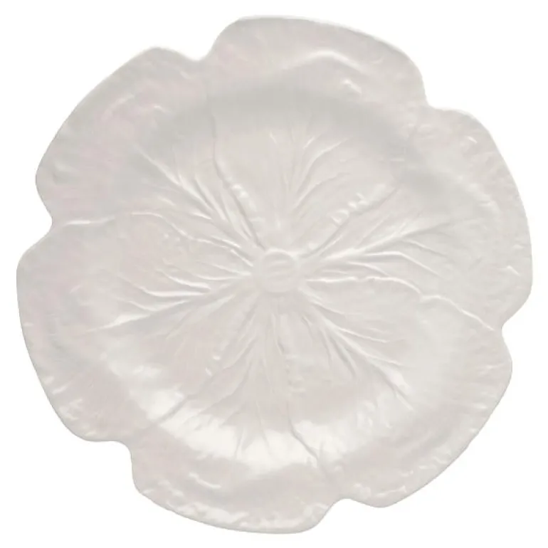 Cabbage Fat 30,5 cm fra Bordallo Pinheiro. Kjøkkenserien Cabbage er en serie med svært detaljerte og realistisk gjengitte skåler og fat som forestiller kålblader, designet av keramikeren Bordallo Pinheiro. Fatene og skålene blir et vakkert innslag til borddekkingen og det større fatet passer perfekt til ost, brød eller frukt.