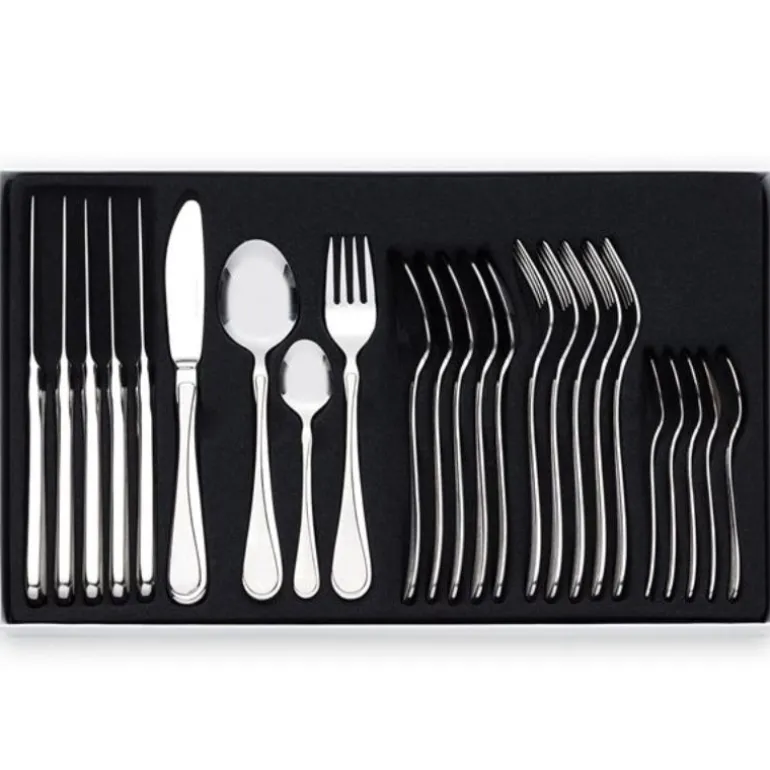 Bestikksett 24 deler fra den myke og detaljrike Carina-serien fra Hardanger Bestikk. Bestikket er utført i børstet stål som gir en robust og glatt finish. Stålet som er av 18/10 rustfritt stål tåler oppvaskmaskin, og produktet har livstidsgaranti. Bestikksettet leveres i gaveeske, og inneholder nok deler til seks personer;