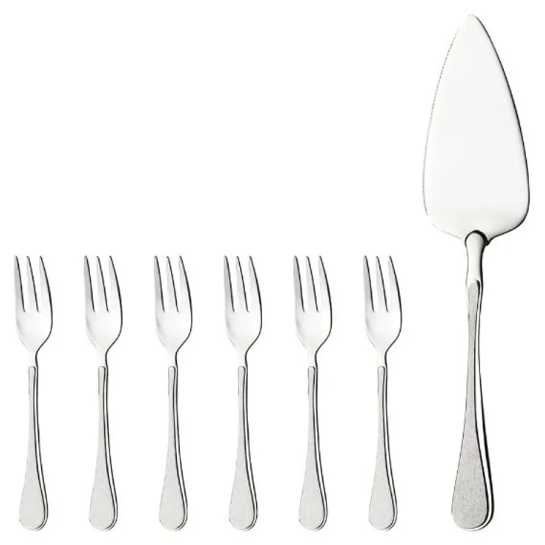 Kakesett fra den myke og detaljrike Carina-serien fra Hardanger Bestikk. Bestikket er utført i børstet stål som gir en robust og glatt finish. Kakesettet inneholder en fintagget kakespade som gir en presis skjærekant. De ytterste tindene på kakegaflene er laget bredere, og deler derfor kakestykket bestemt. Stålet som er av 18/10 rustfritt stål tåler oppvaskmaskin, og produktet har livstidsgaranti. Kakesettet leveres i gaveeske, og inneholder nok deler til seks personer;