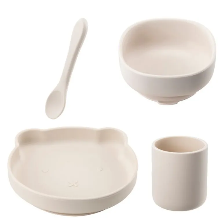 Chic Kids barneservise i krem fra Modern House inneholder fire deler: en asjett, en skål, et krus og en spiseskje. Settet er laget av silikon som er LFGD-sertifisert og uten skadelige kjemikalier. Materialet er mykt og tåler fall uten å knuses, noe som gjør det egnet for små barn i opplæring til å spise selv.