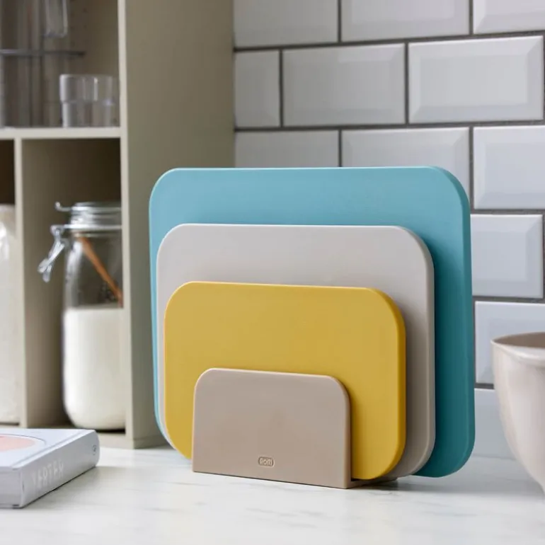 Settet inkluderer en praktisk oppbevaringsholder som gjør det enkelt å holde orden. Holderen er designet for å gi god ventilasjon og hygiene, med riller i bunnen som sikrer at brettene tørker ordentlig hvis de settes på plass fuktige. Skjærebrettene står med litt avstand fra hverandre, noe som gjør det både hygienisk og plassbesparende.
